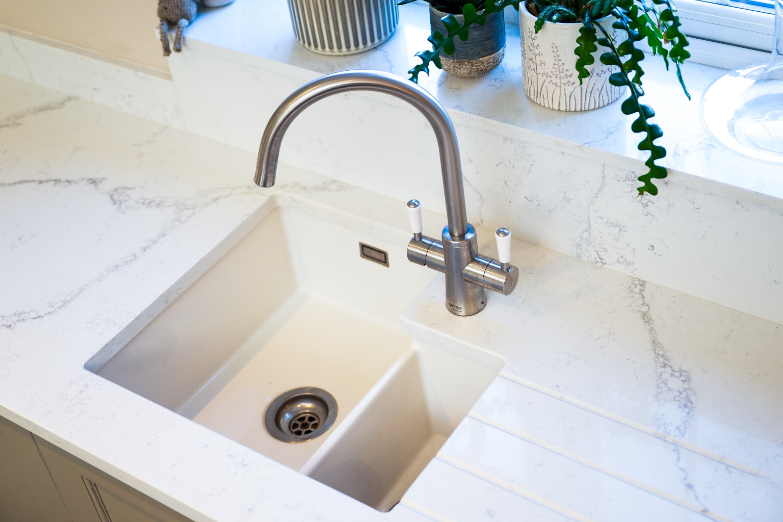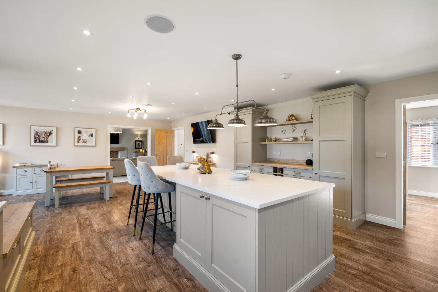 Luxury kitchen fitted by LN Kitchens, complete with integrated appliances, Quartz worktops, shaker cabinetry, wine cooler, boiling water tap and range cooker.