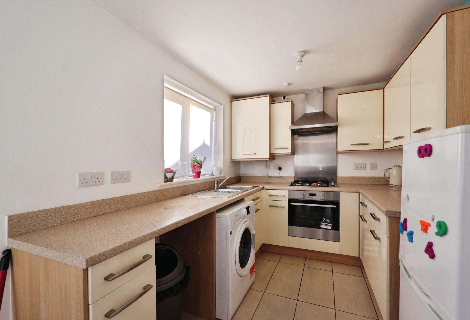 Positioned to the rear of the home, the kitchen/diner (5.73m x 2.32m) forms the heart of the property. Finished with tiled flooring, the kitchen is fitted with a range of wall and base units, work surfaces, sink and drainer, and space for a fridge freezer and additional appliances. French doors open directly onto the rear garden, allowing plenty of natural light and creating a seamless connection between indoor and outdoor living.