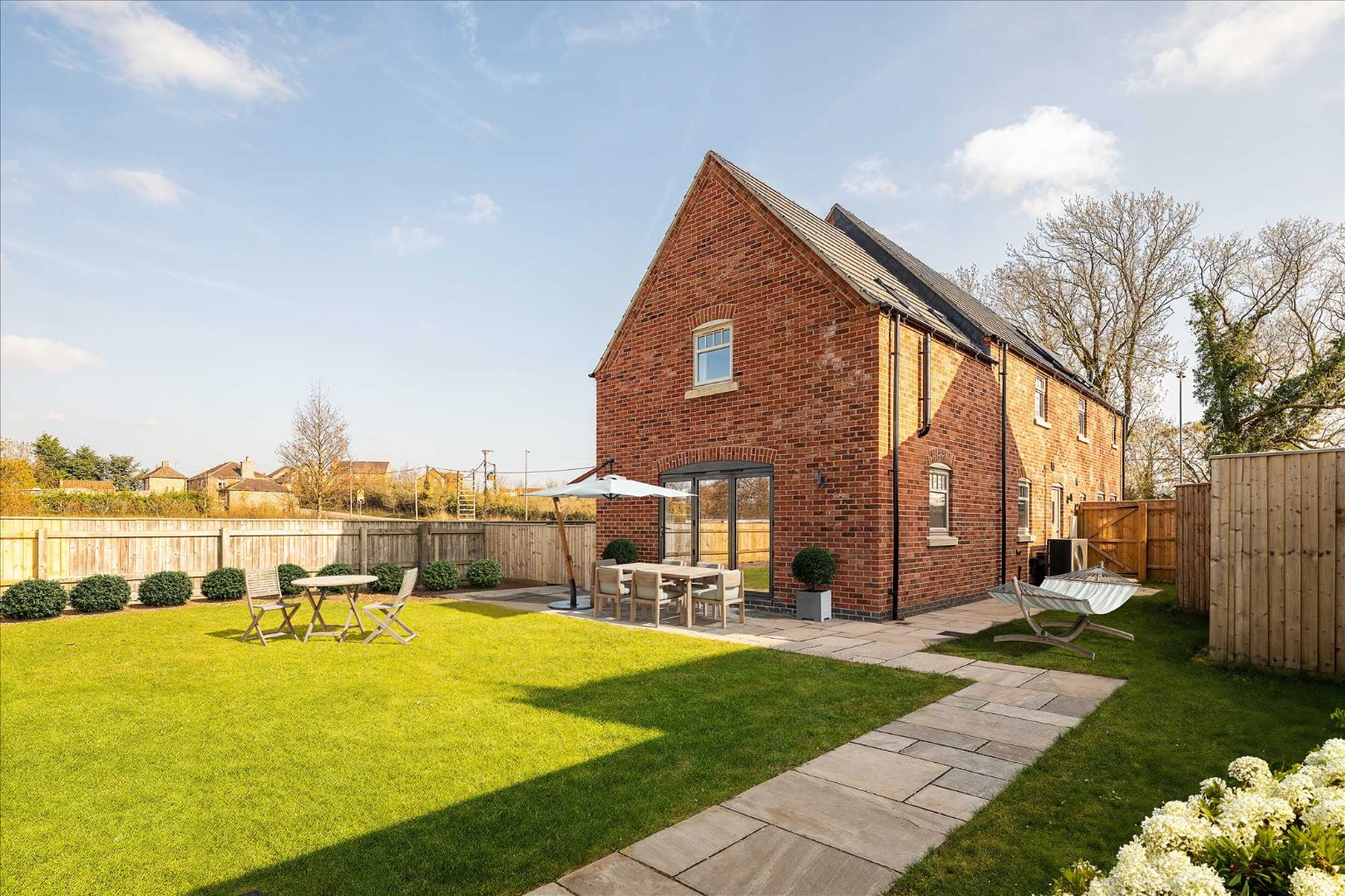 -Landscaped front and rear garden with a sandstone patio area
