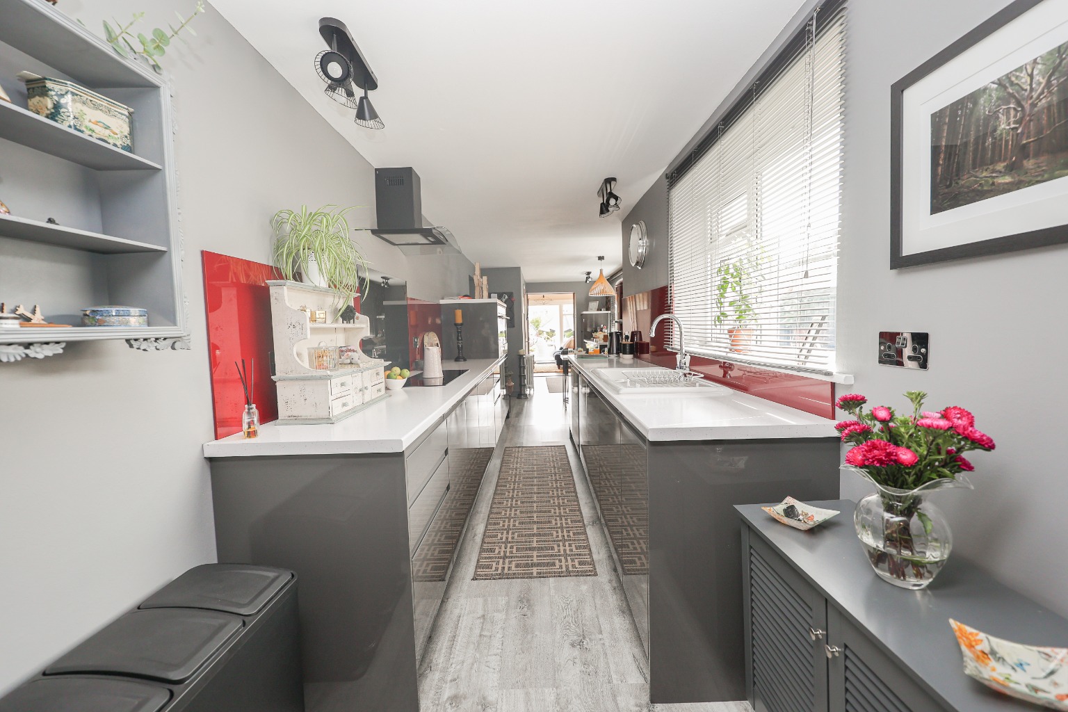 A gated, shared passageway leads to the front of the home, where a gravelled garden sits behind mature hedging. A pathway runs alongside to the entrance door, opening into a welcoming hallway with fitted carpet, radiator, and stairs to the first floor. To the right, the Lounge (3.33m x 3.84m / 10'11" x 12'7") exudes character, with original wooden flooring, a striking period fireplace, a bay-style front window, high ceilings with coving, tall skirting boards, and a wall-mounted radiator. The Dining Room (4.52m x 3.86m / 14'10" x 12'8") continues this theme with more original wood flooring, a rear window, wall-mounted radiator, and under-stairs storage behind a decorative barn-style feature door. From here, open-plan access leads into the Extended Kitchen (full length 9.86m x 2.84m / 32'4" x 9'4") — a spacious, light-filled hub of the home. The kitchen offers ample base unit storage, a ceramic one-bowl sink and drainer, integrated dishwasher, washing machine, induction hob with extractor, side-by-side oven/microwave/warming drawer, and space for a fridge freezer (current one will stay if required). Laminate flooring runs throughout, and three side windows plus French doors to the Sun Room (3.96m x 2.97m / 13'0" x 9'9") ensure a bright and airy feel. There’s also a side door to the passageway and access to a downstairs WC, fitted with a hand basin and tiled splashbacks. The sunroom at the rear is a delightful addition, with a solid roof, laminate flooring, radiator, and French doors opening onto the garden.