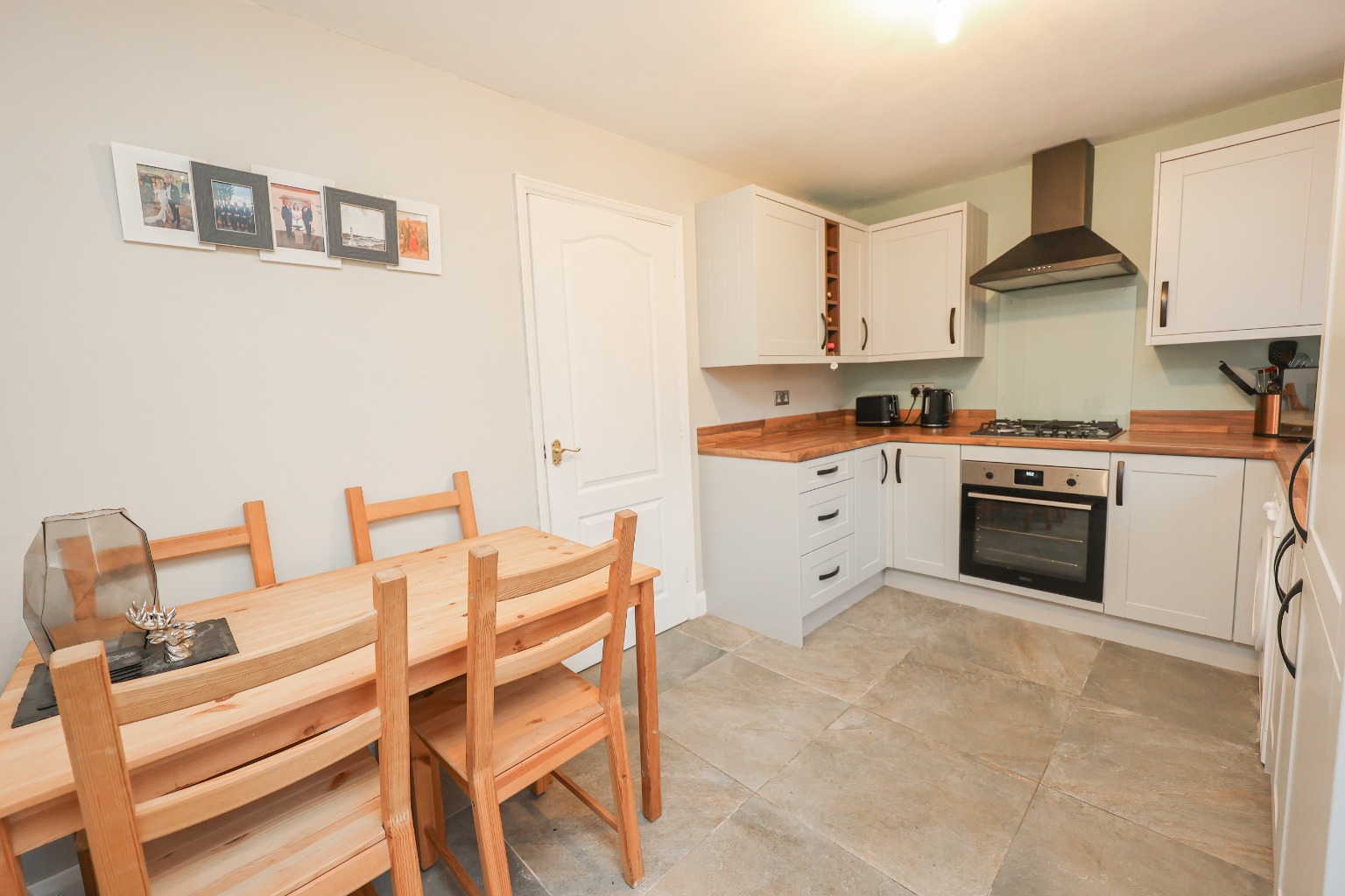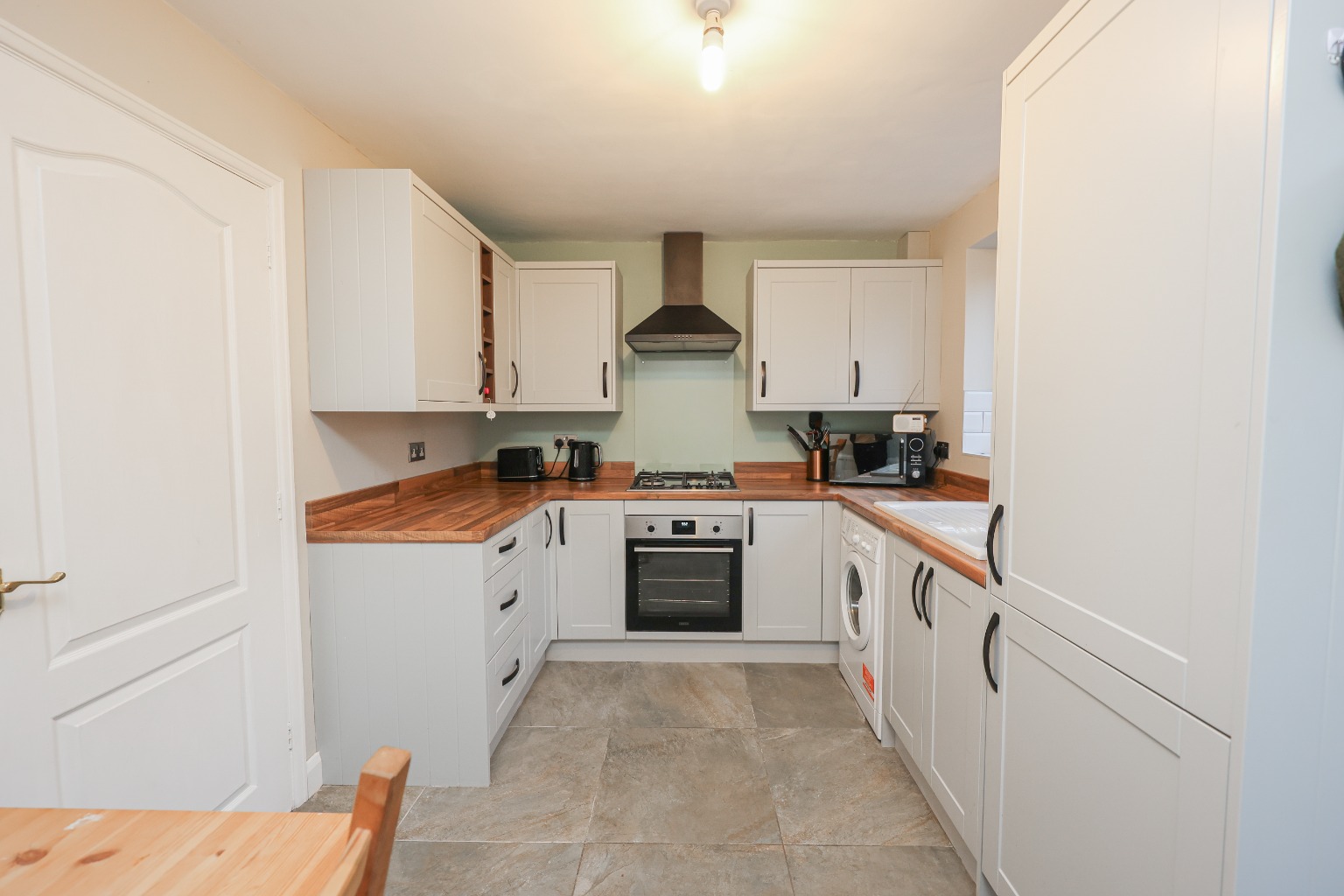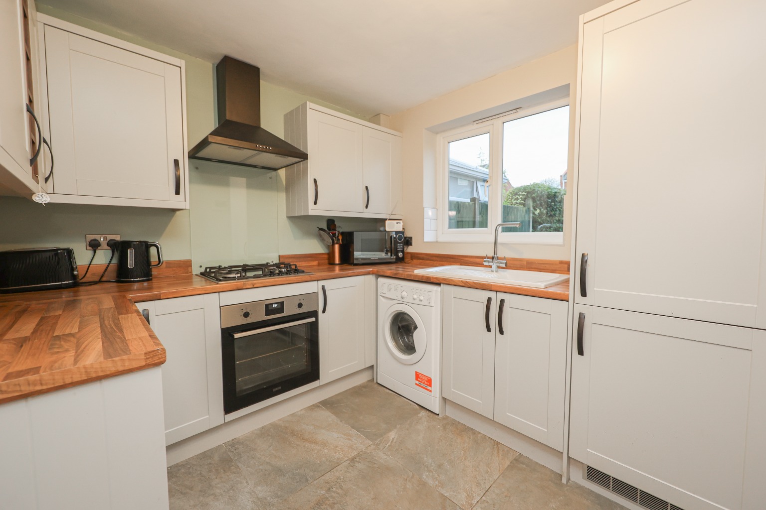 To the rear lies the kitchen (3.94m x 2.82m), fitted with a range of modern wall and base units, tiled splashbacks, and tiled flooring. Integrated appliances include a fridge, freezer, oven, and gas hob with extractor, alongside space and plumbing for a washing machine. A window overlooks the rear garden, and a door provides direct access outside.