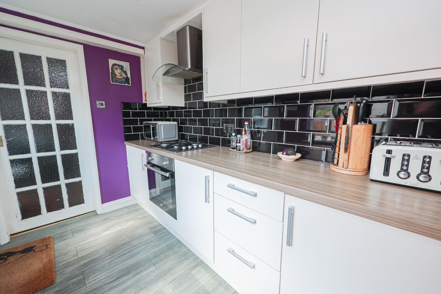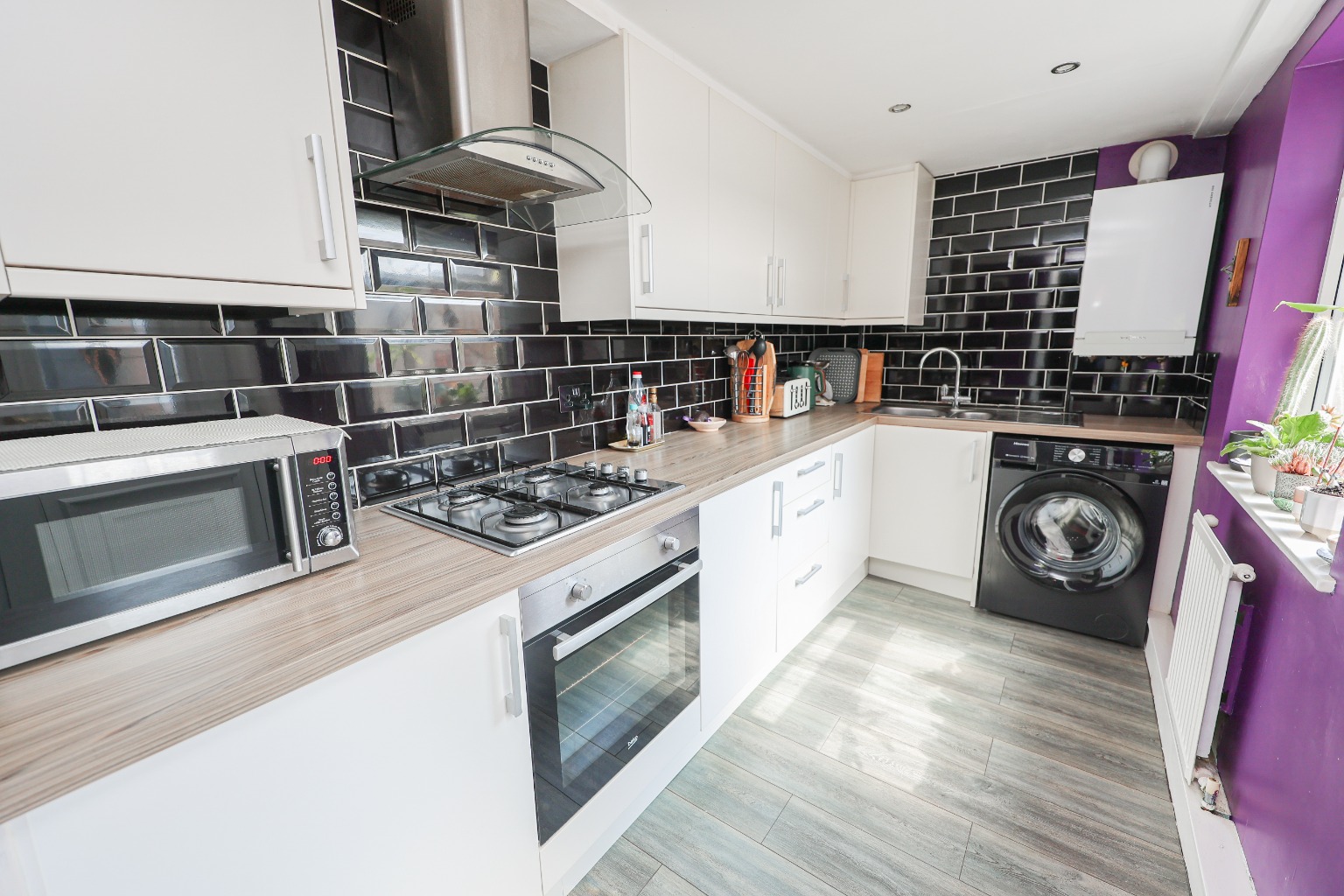 Tucked at the rear, the Kitchen (3.43m x 1.80m / 11'3" x 5'11") blends practicality with clean, modern design. Sleek cabinetry offers ample storage, while square-edge worktops and tiled splashbacks give it a fresh finish. There’s a built-in electric oven, gas hob with extractor above, and space for a washing machine and fridge-freezer. A door leads straight out to the rear courtyard — perfect for summer evenings where indoor and outdoor living flow seamlessly.