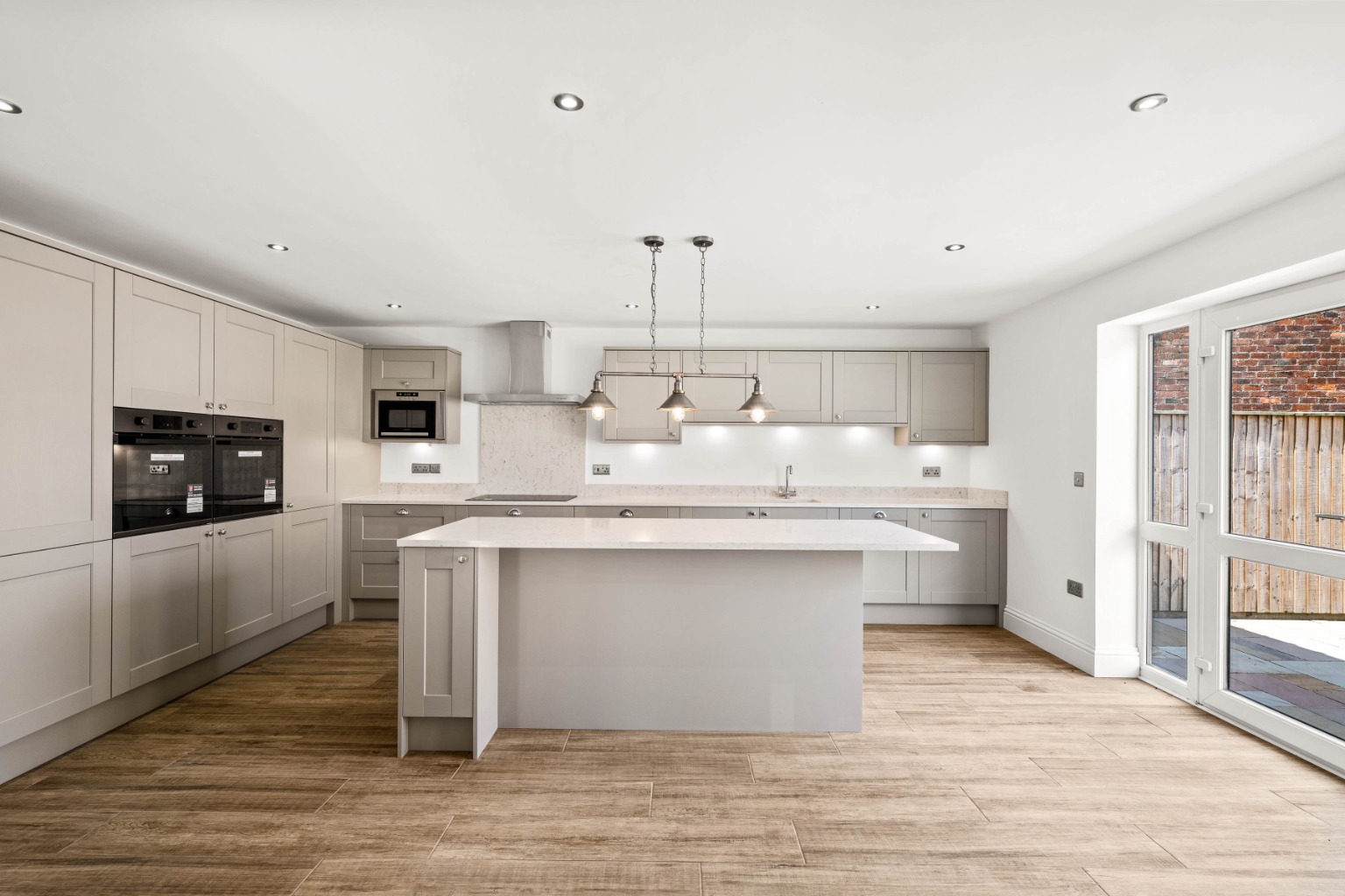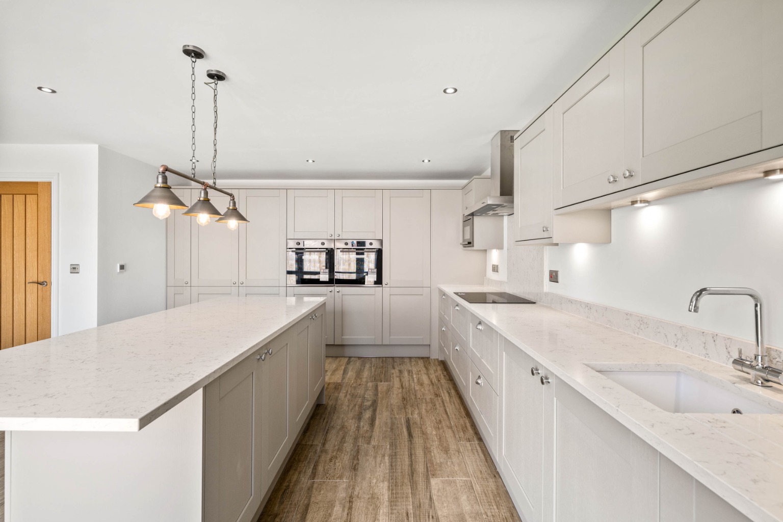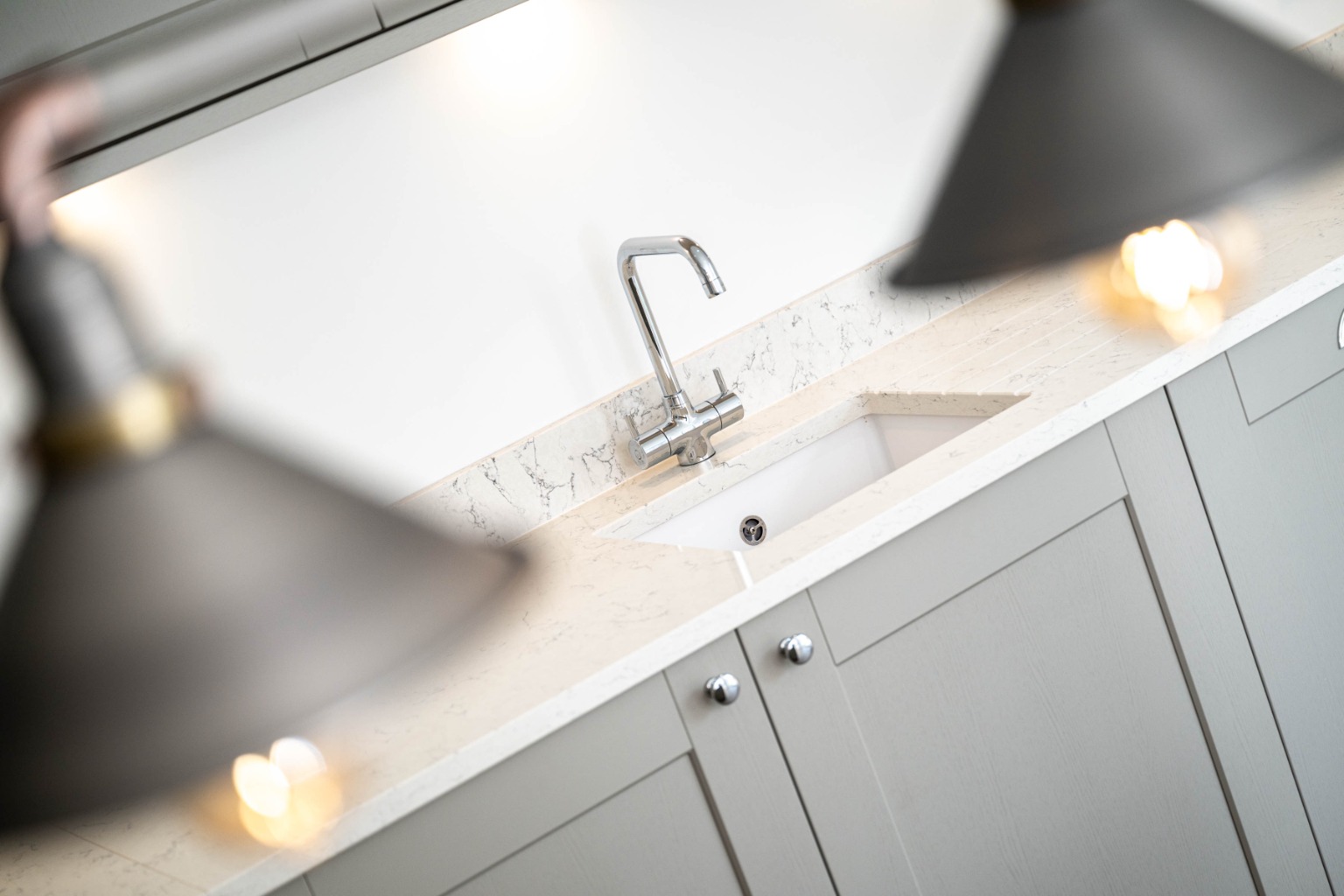 - Quartz worktop with wood grain shaker style cupboard doors in pebble finish