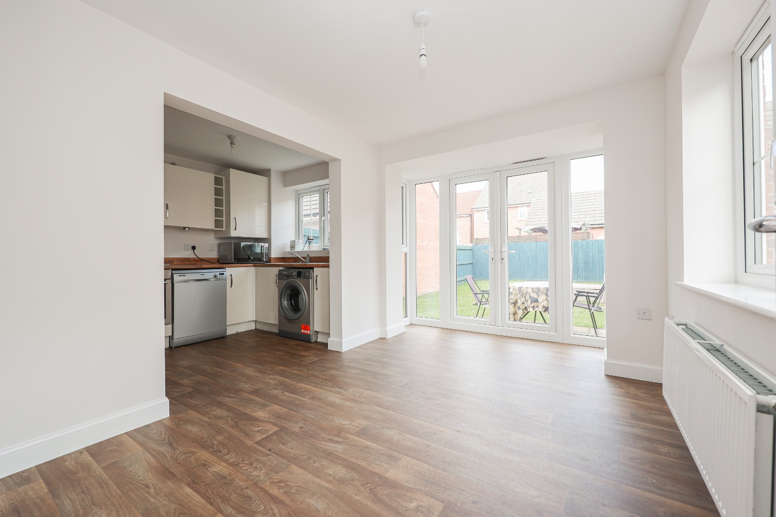 Enter via the front door into a welcoming Entrance Hallway, complete with modern vinyl flooring, a wall-mounted radiator, stairs rising to the first floor, and an understairs storage cupboard housing a convenient downstairs WC — fitted with a low-level flush toilet, wash basin with splashback, radiator, extractor fan, and recently updated flooring. The Lounge (3.17m x 4.92m / 10′5″ x 16′2″) is a bright, spacious room thanks to its dual-aspect layout, with windows to both the front and side, fitted carpet, and two radiators providing warmth and comfort. At the heart of the home is the Dining Area (2.64m x 3.92m / 8′8″ x 12′10″), featuring laminate flooring, a front-facing window, French doors opening onto the rear garden, and open-plan access to the kitchen — a lovely flow for family living or entertaining. The Kitchen (5.08m x 2.53m / 16′8″ x 8′4″) is well-appointed with a range of wall and base units, stainless steel sink and drainer, integrated electric oven with gas hob and extractor above, and space/plumbing for a washing machine, dishwasher and fridge-freezer. The gas central heating boiler is neatly housed here, and a large window to the side ensures natural light.