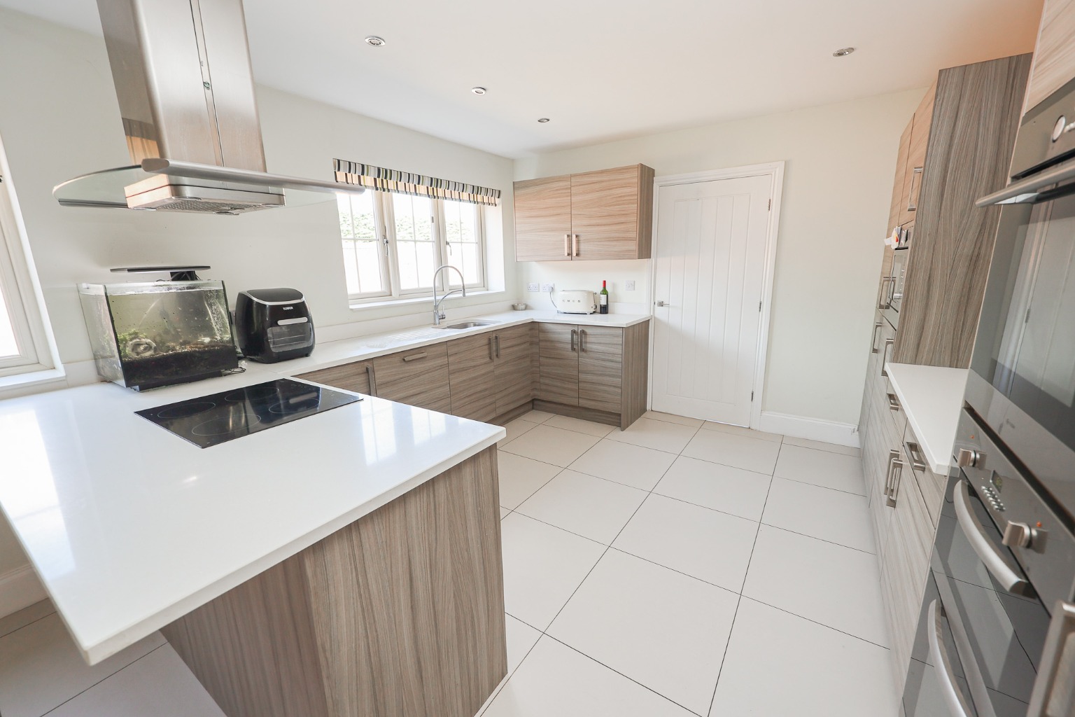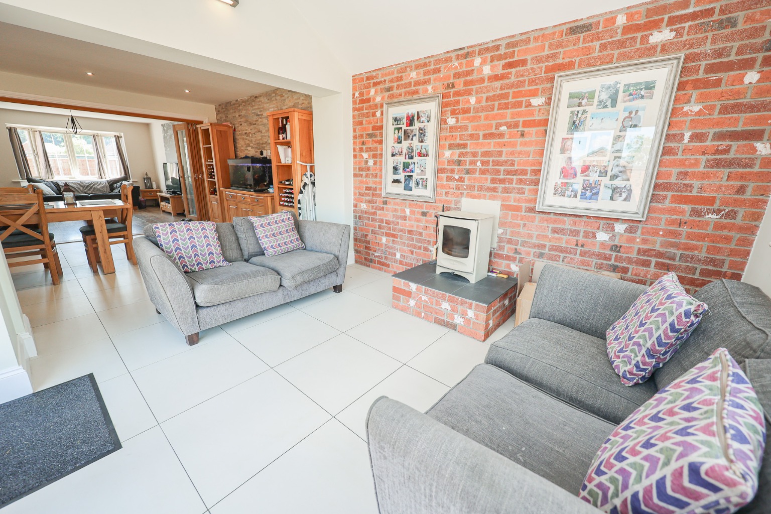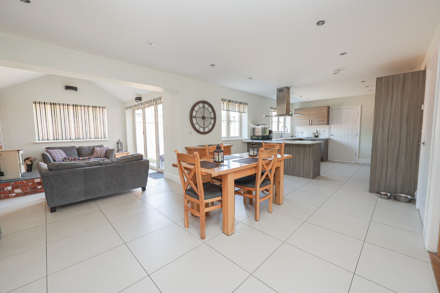 Stepping into the gracious Entrance Hall, you're welcomed by tiled flooring, recessed spotlights, and practical under-stairs storage—a fitting introduction to this well-planned home. Relax in the Lounge (4.58 × 3.66 m / 15'0″ × 12'0″), a bright bay-fronted living space complete with wood-effect flooring and efficient underfloor heating—ideal for cosy evenings. The centrepiece is the Open Plan Kitchen Diner (8.81 × 3.64 m / 28'10″ × 11'11″)—a stunning, light-filled hub equipped with integrated appliances, dual fridges, induction hob, and tiled flooring with underfloor heating. It's tailored for family life and entertaining alike. Adjacent is the Sun Room (3.46 × 2.95 m / 11'4″ × 9'8″), stretching garden views with bifold doors, tiled flooring, and a charming log burner. Functional spaces include the Utility Room (2.53 × 2.34 m / 8'3″ × 7'8″) with storage, plumbing and garden access, plus the stylish Cloakroom/WC, fitted with electric underfloor heating, modern suite, and tiled floor.