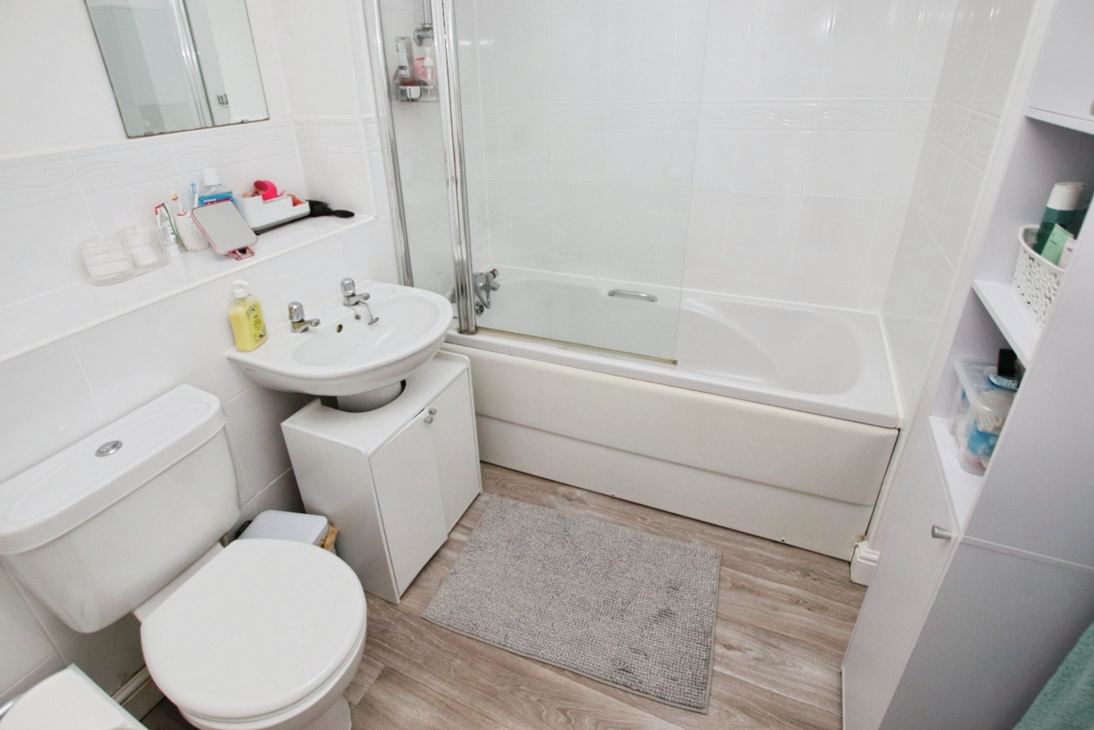 Vinyl (easy-clean) flooring. Panelled bath with overhead shower, fully tiled shower surround and tiled splashback behind basin and WC. White suite with extractor fan.