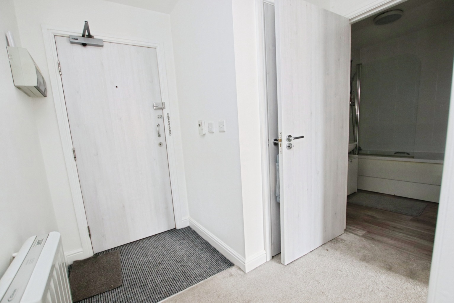 Fully carpeted hallway with consumer unit and radiator. Handy hall storage cupboard.