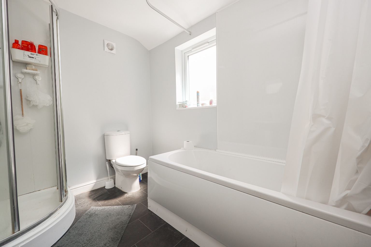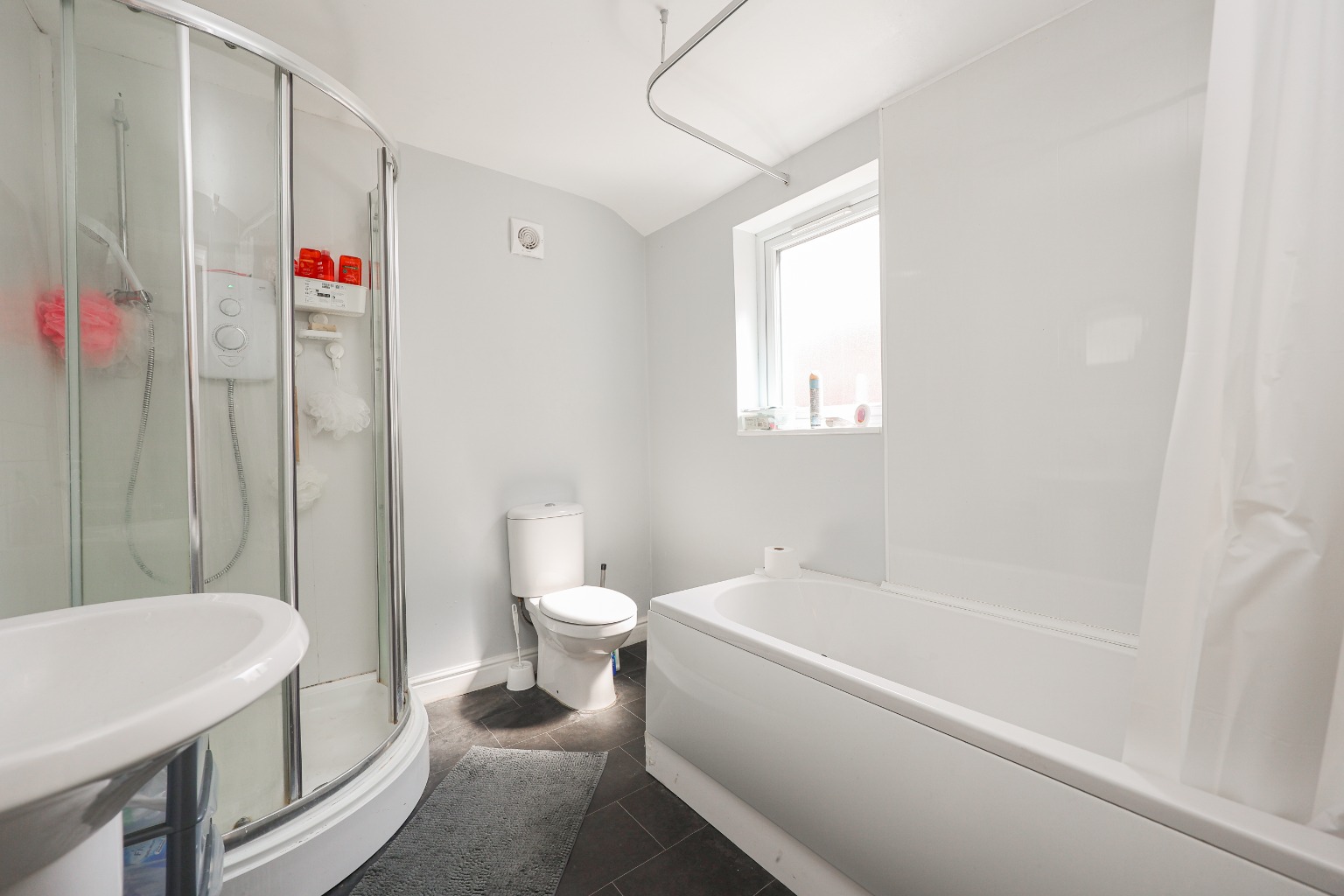 Spacious and bright with both a full-sized bath and a corner shower cubicle, plus WC and washbasin. A frosted window offers natural light while maintaining privacy.