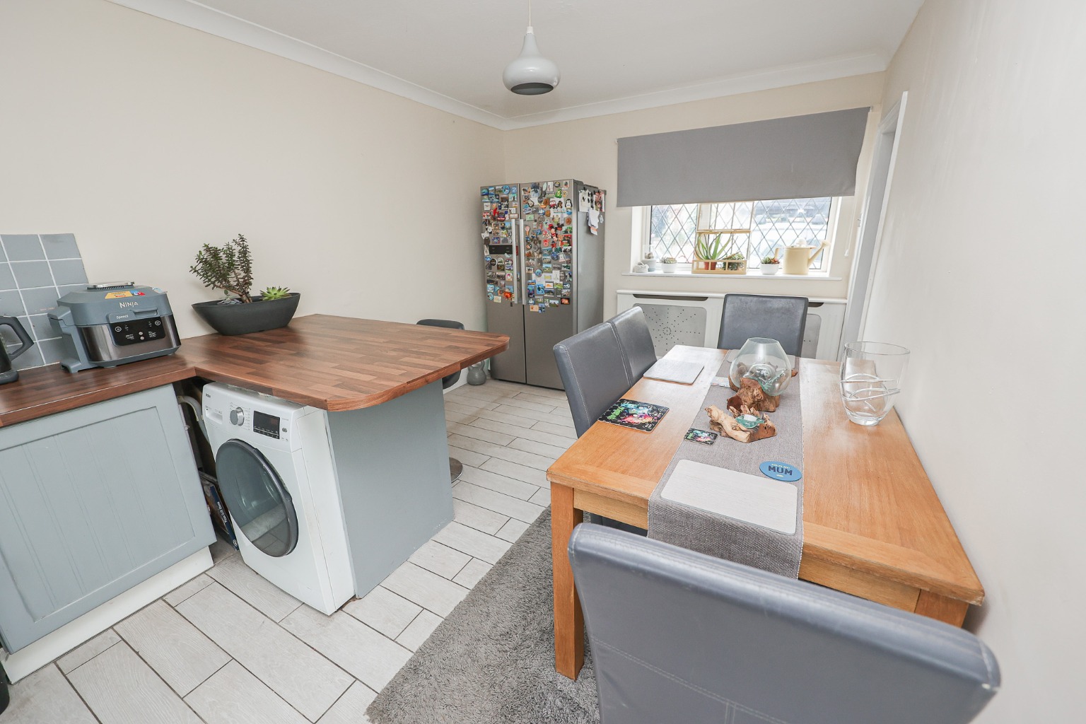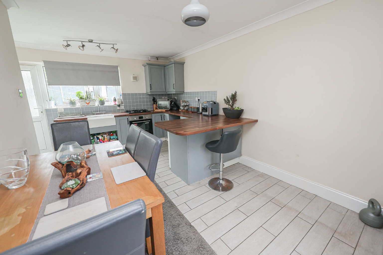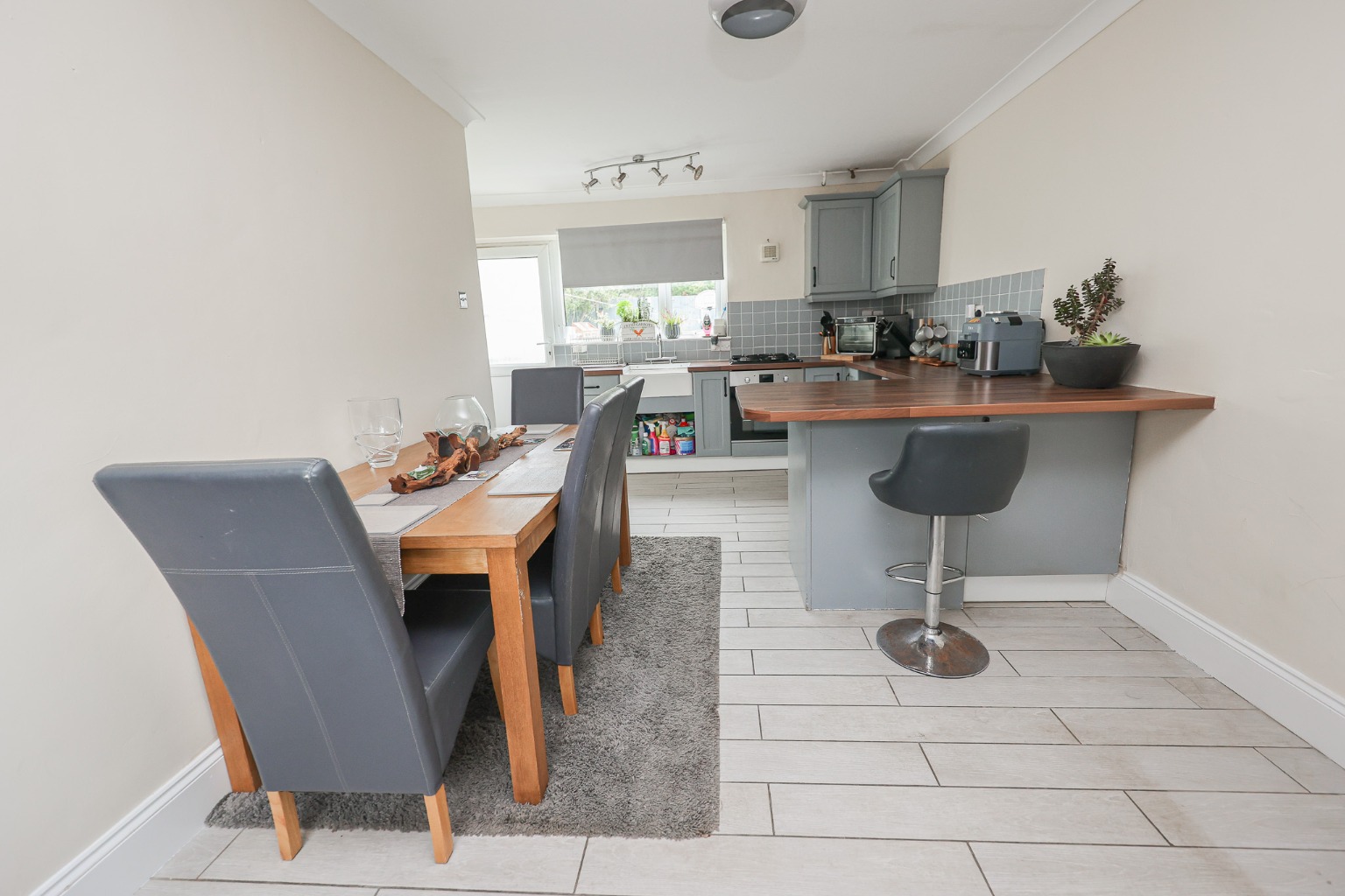 Back inside, the Kitchen Diner (5.44 m × 4.06 m / 17′10″ × 13′4″) spans the full depth of the home, making it the natural heart of the household. With pale tiled flooring, painted shaker-style units, and generous worktop space, it’s a room made for both cooking and conversation. A breakfast bar provides casual seating for morning coffees, while the adjacent dining area comfortably fits a large table for family meals or entertaining friends. Light flows in through dual aspect windows and a rear door opens directly onto the garden — perfect for al fresco evenings.