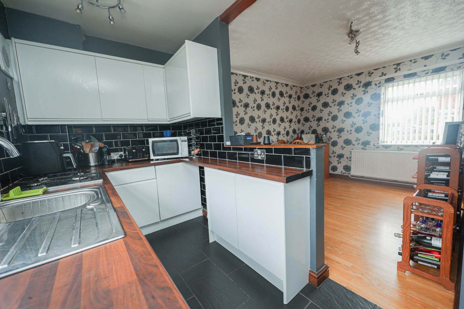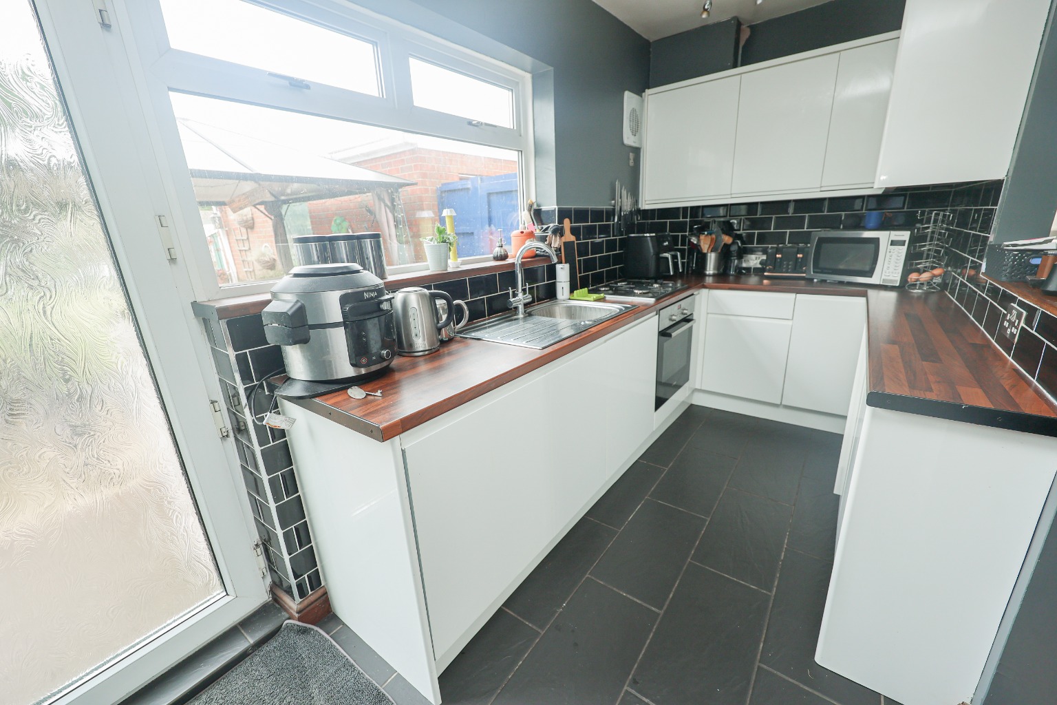 With a range of matching wall and base units with worktops over, stainless steel sink and drainer unit, oven and hob, integrated dishwasher, integrated fridge and integrated washing machine, tiled splashbacks, tiled flooring, windows to the rear aspect, door to the rear aspect and understairs cupboard which is currently used as a pantry.