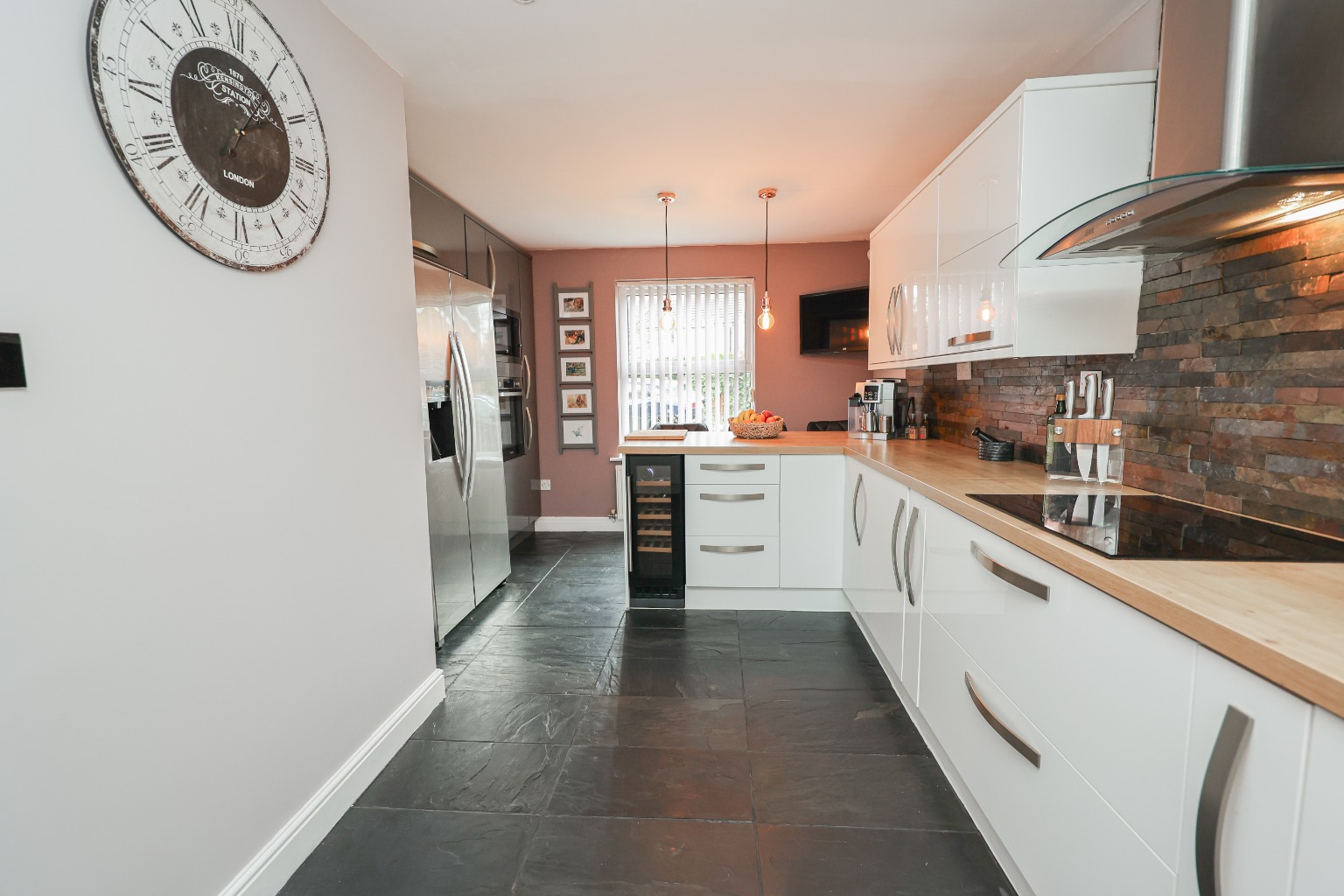 With matching wall and base units with worktops over, sink, integrated oven, hob, extractor fan, space for fridge freezer, integrated microwave, wine fridge, integrated dishwasher, Instant Boiling water tap, tiled walls, tiled flooring, windows to both the front and rear aspects, and wall mounted panel radiator.