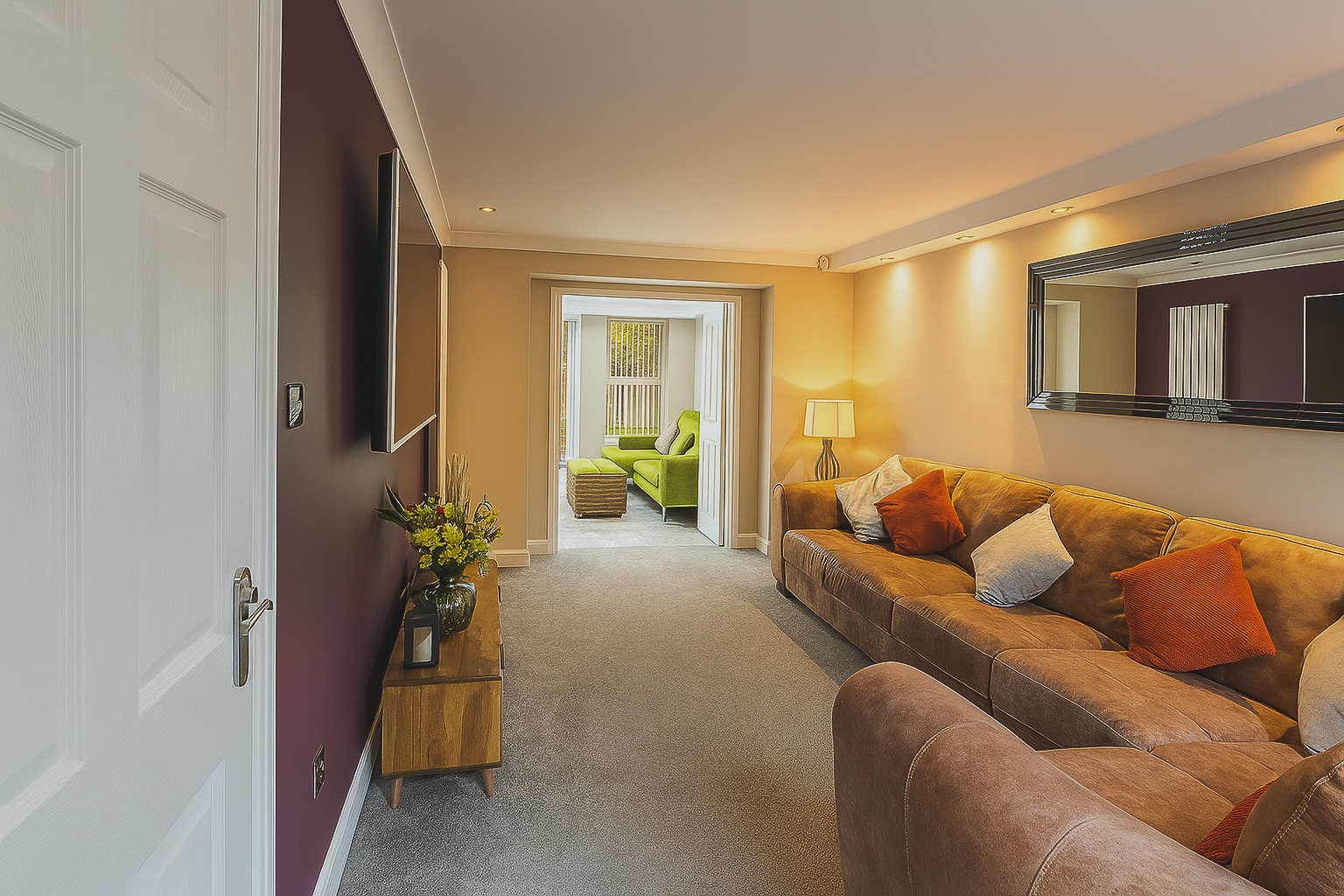 With fitted carpet, radiator, wall mounted panel radiator, folding doors through to the orangery, and window to the front aspect.