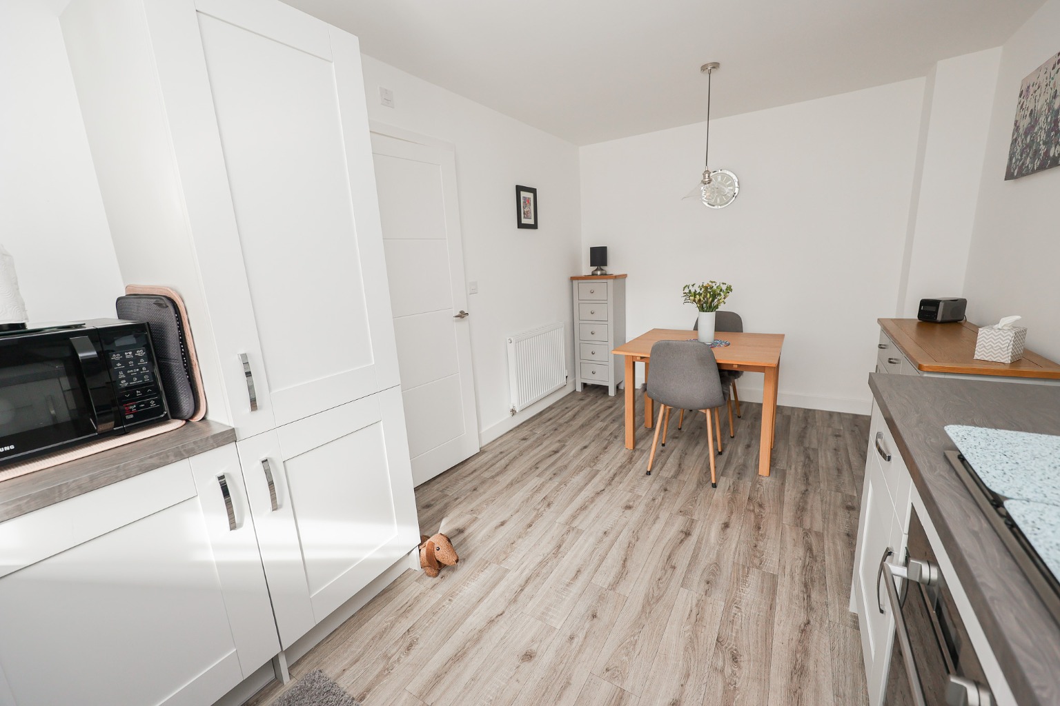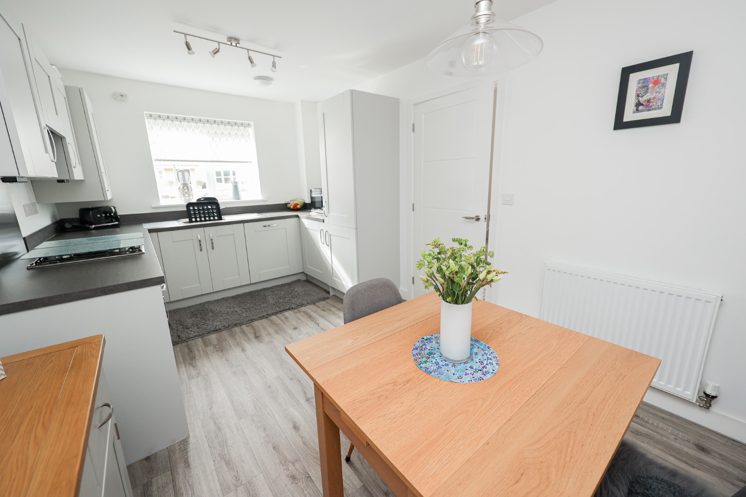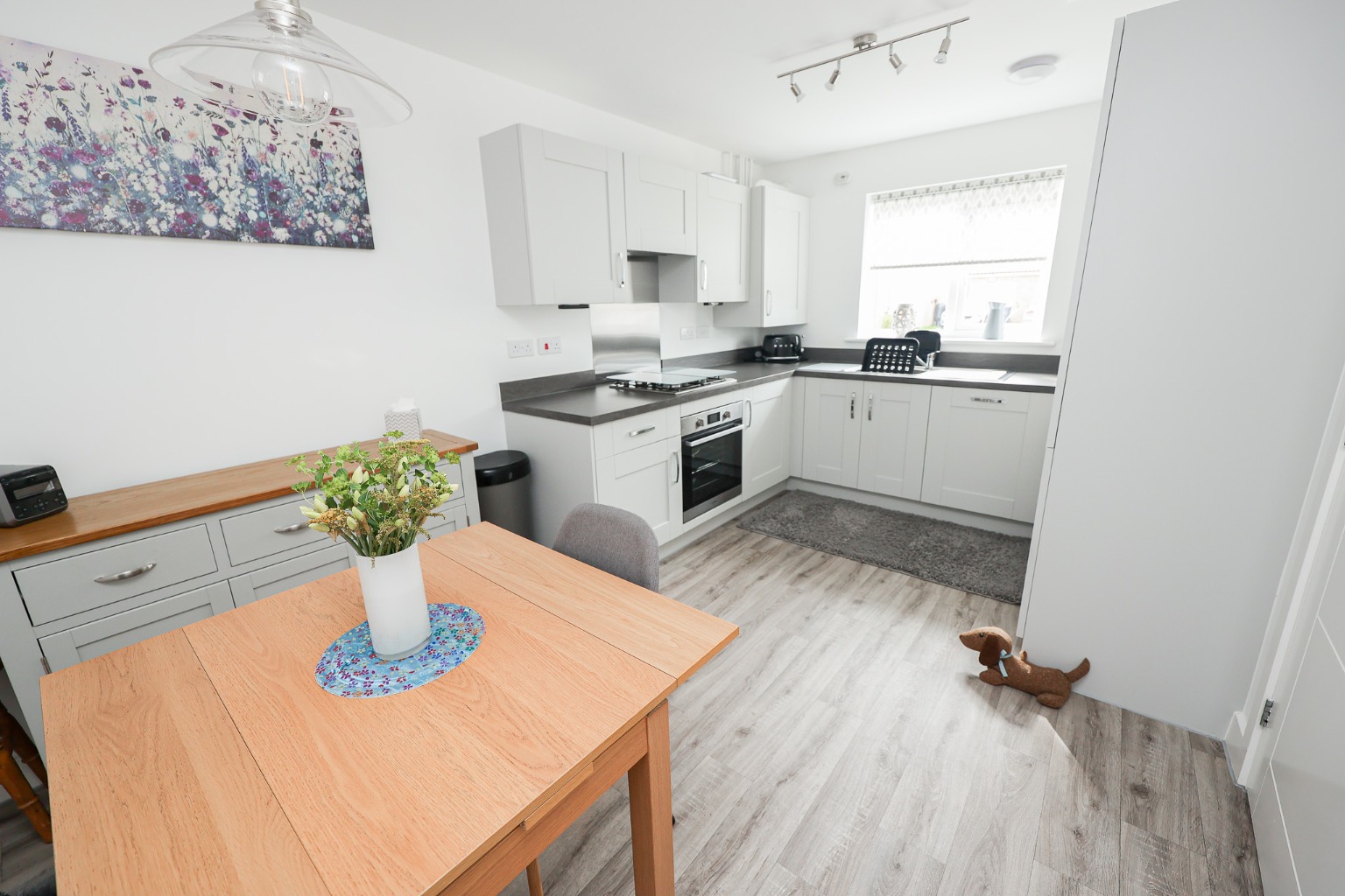 This gorgeous kitchen/diner features matching wall and base units with worktops, sink and drainer, electric oven, gas hob, extractor fan, integrated dishwasher and washing machine, integrated fridge freezer, space for table and chairs and window to front aspect.