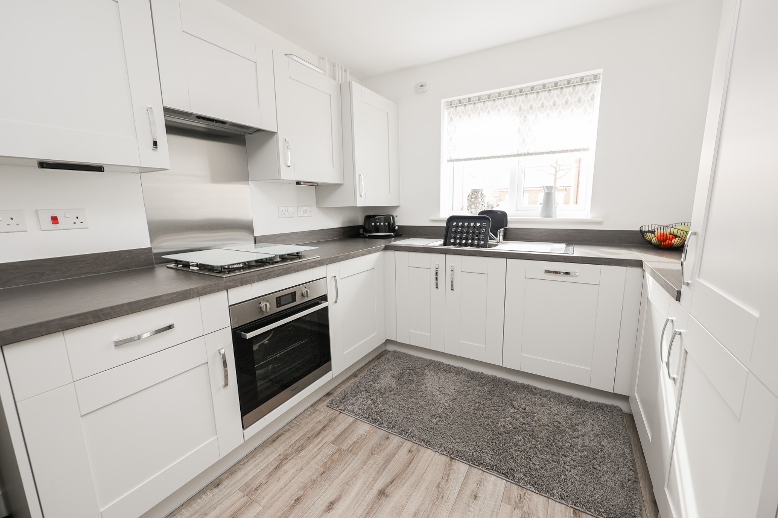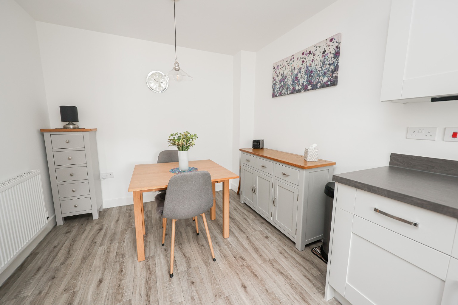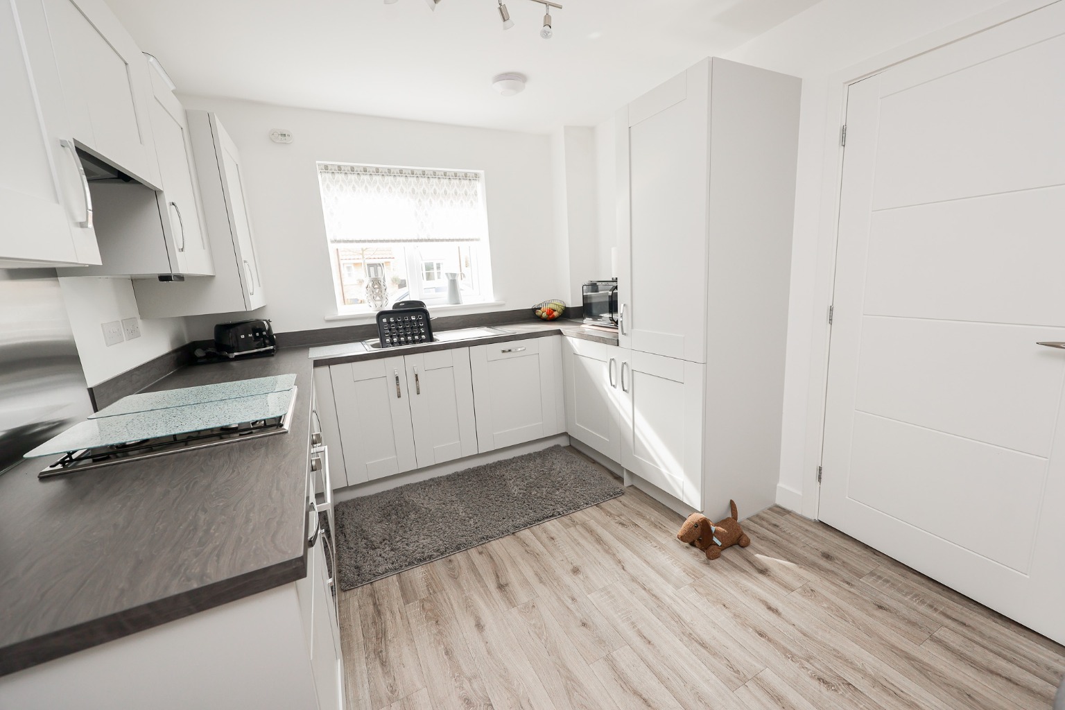 This gorgeous kitchen/diner features matching wall and base units with worktops, sink and drainer, electric oven, gas hob, extractor fan, integrated dishwasher and washing machine, integrated fridge freezer, space for table and chairs and window to front aspect.