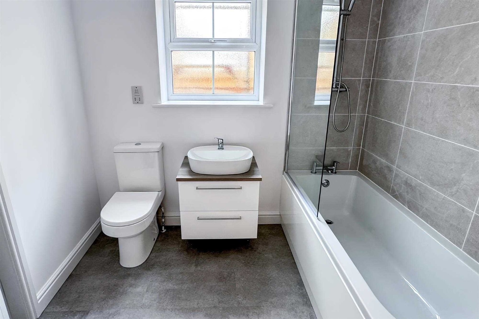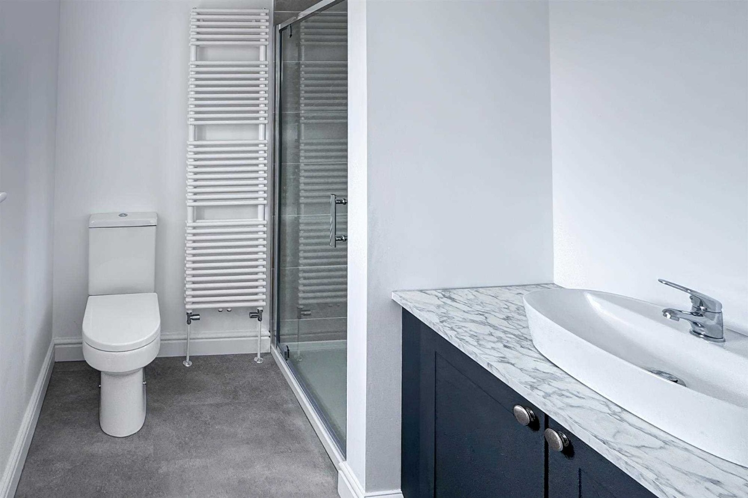 - Walk-in shower with low-rise tray, chrome shower, glass door and full tiling